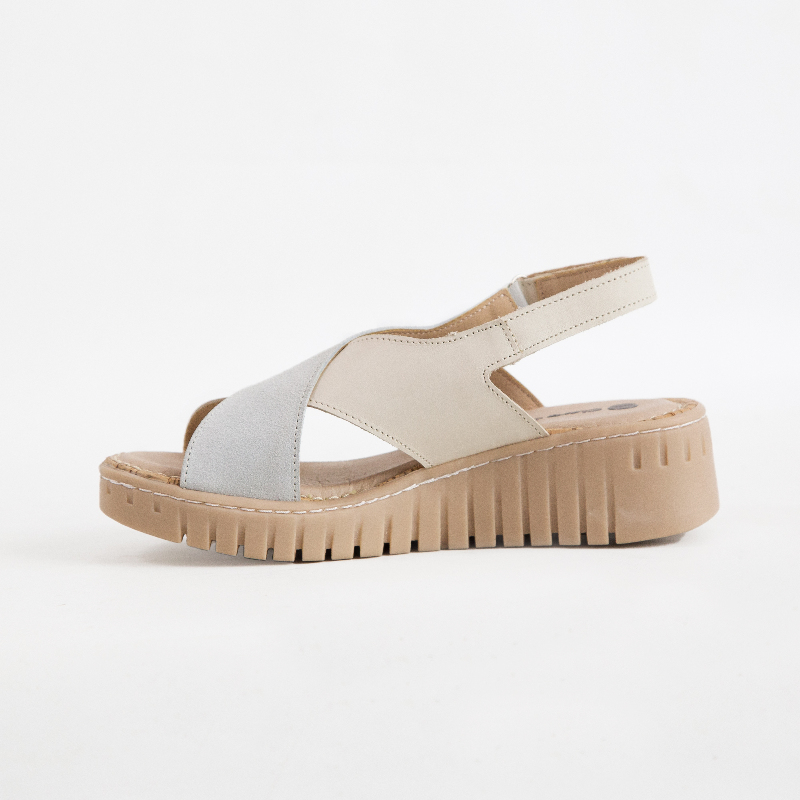 Material: Cuero vacuno y gamuzón. Diseño: Tiras anchas cruzadas. Sistema de ajuste: Velcro en la parte del talón, lo que facilita su ajuste. Plantilla: Acolchada para un confort superior durante el uso. Horma: Estándar. Altura de la suela: Aproximadamente 5 cm