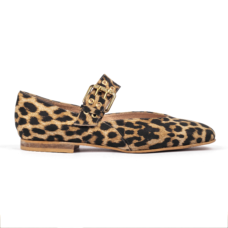 Chatita clasica. Material Cuero vacuno print detalle de tira regulable. Altura de taco 1.5cm