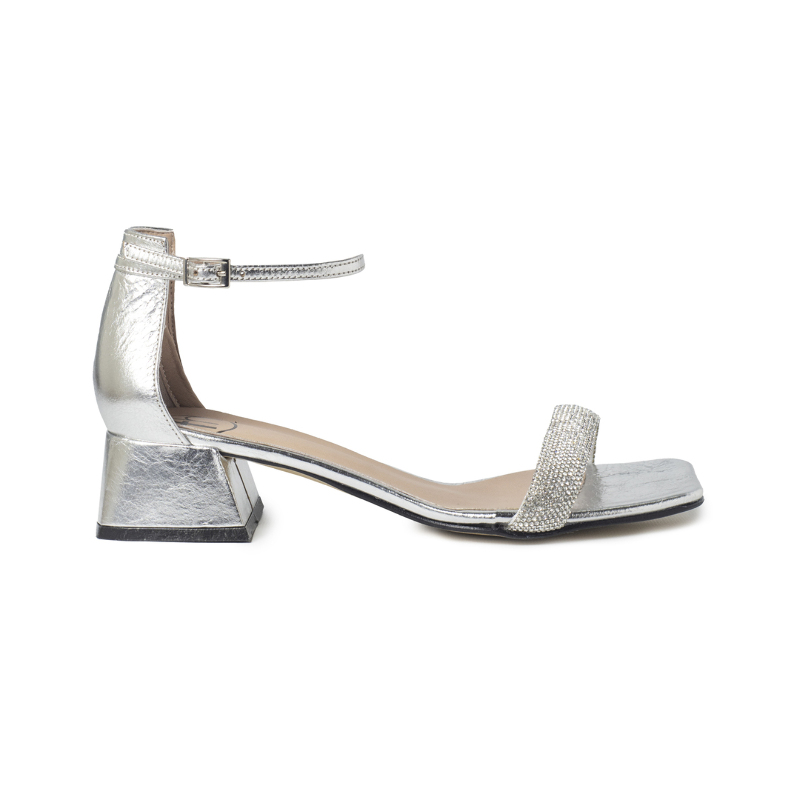 Sandalia. Material cuero vacuno metalizado faja strass. Altura de taco 3,5cm