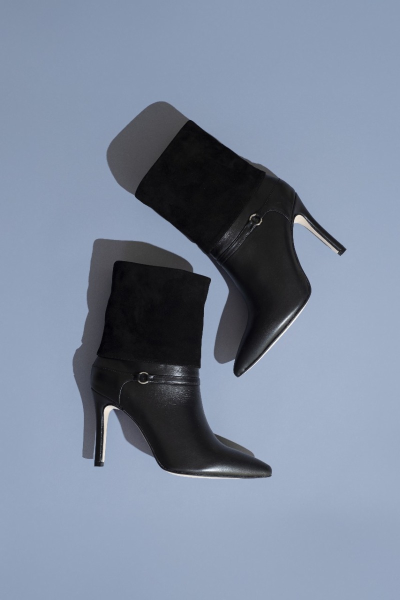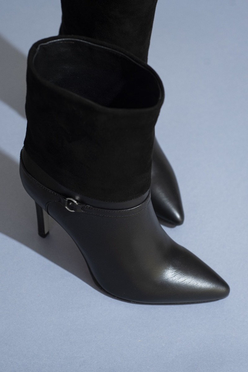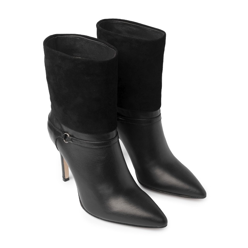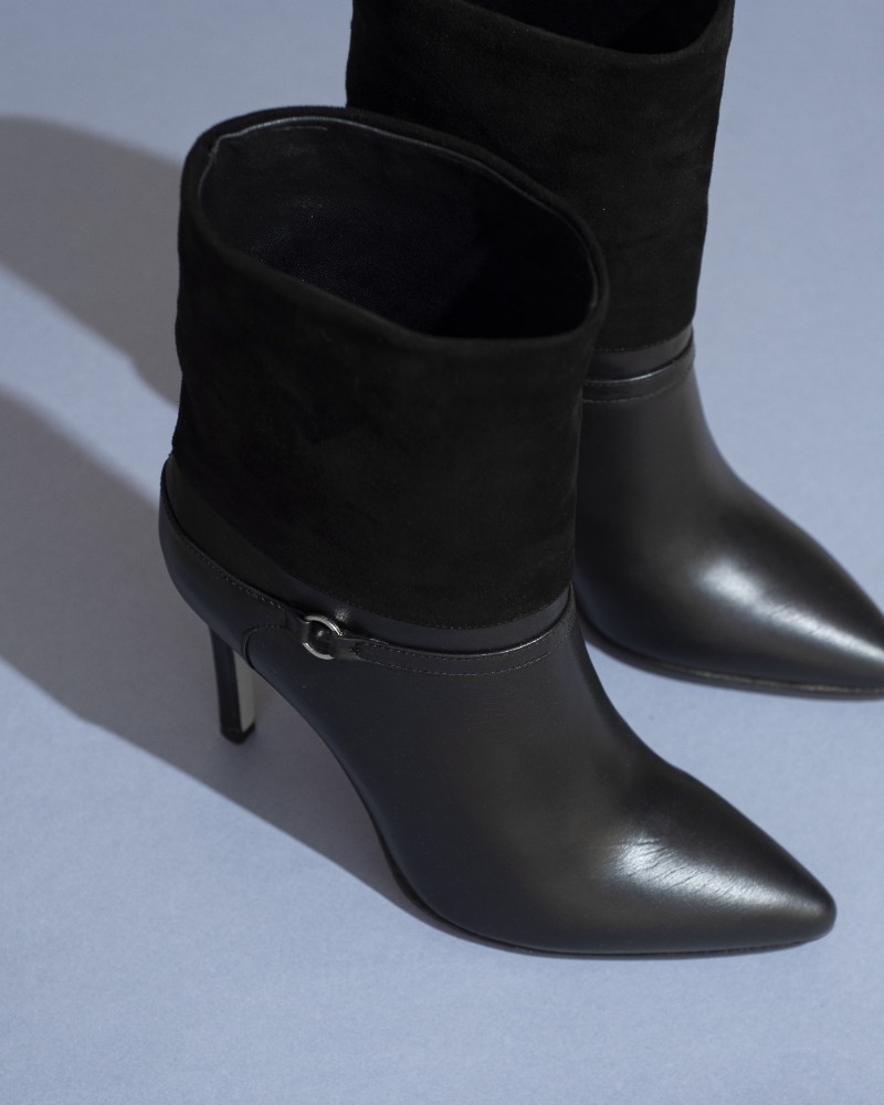 Botineta de cuero combinada. Solapa de caña efecto doblado con detalle de hebilla lateral. Altura de taco 8,5cm