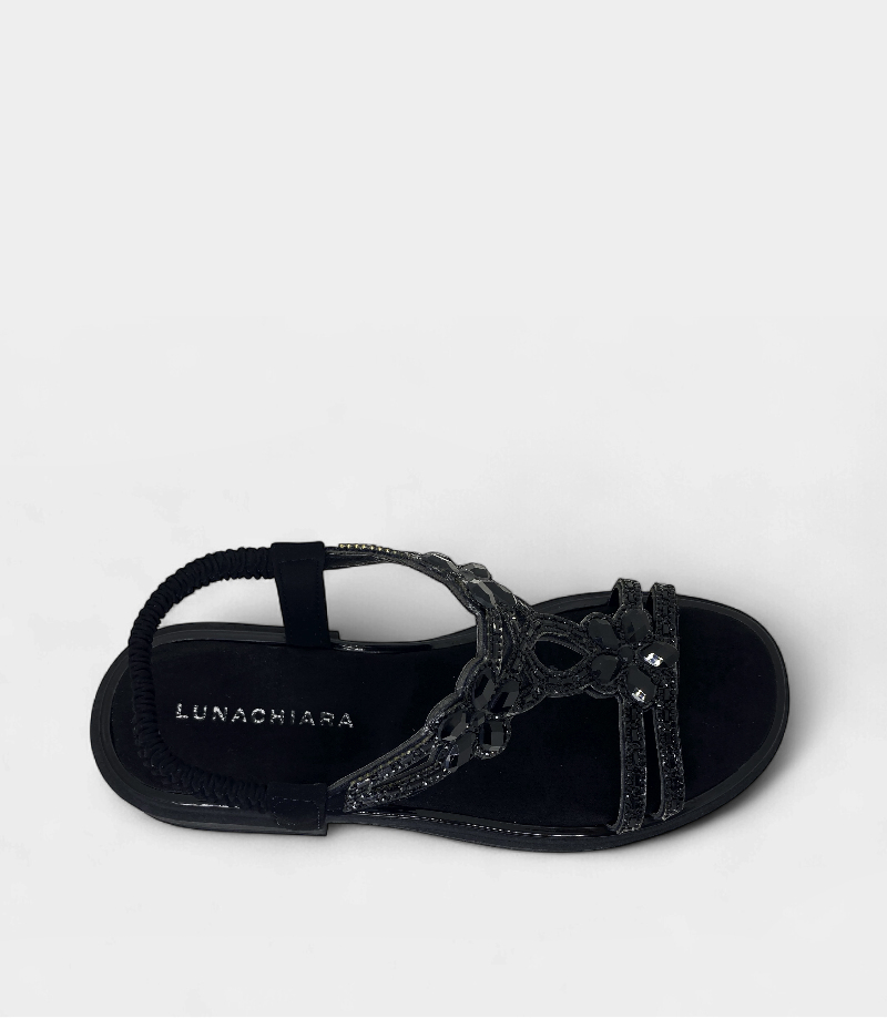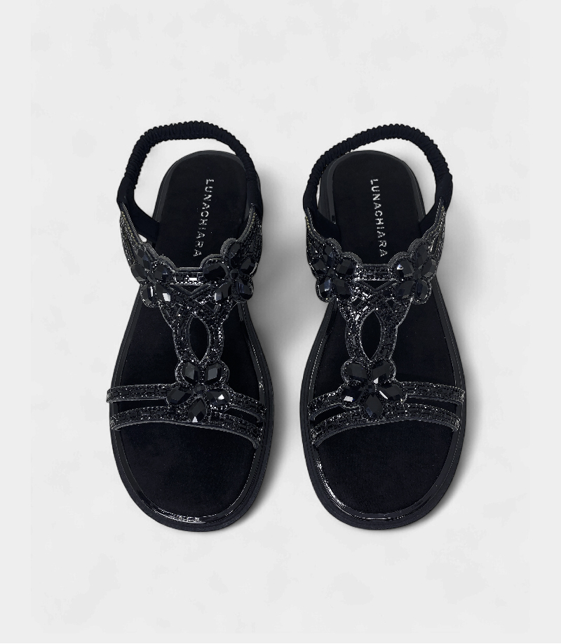 Son perfectas para quienes buscan un calzado sofisticado sin sacrificar el confort. El diseño de tiras frontales adornadas con apliques de strass y un detalle de flores, junto a la correa elástica en el talón, te darán un ajuste perfecto.