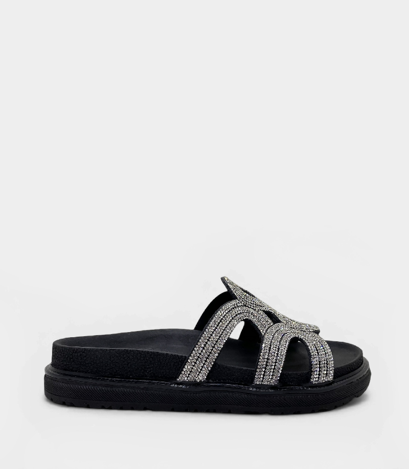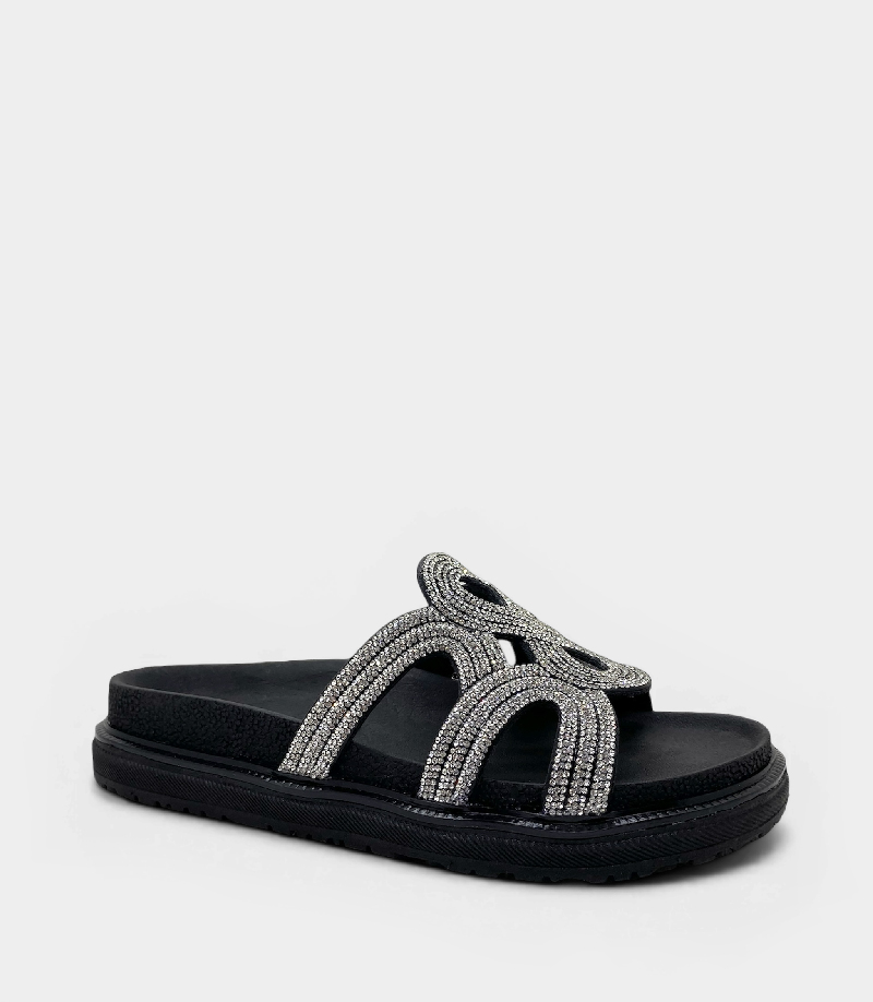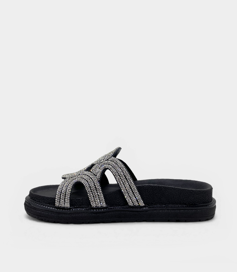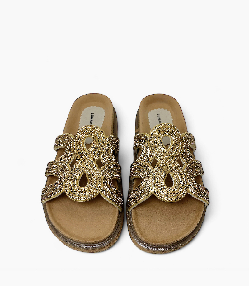 Su capellada de diseño único, con tiras entrelazadas cubiertas de brillos que forman un patrón central de nudos infinito, está pensada para deslumbrar. Cuentan con una cómoda plantilla acolchada y una suela de plataforma plana