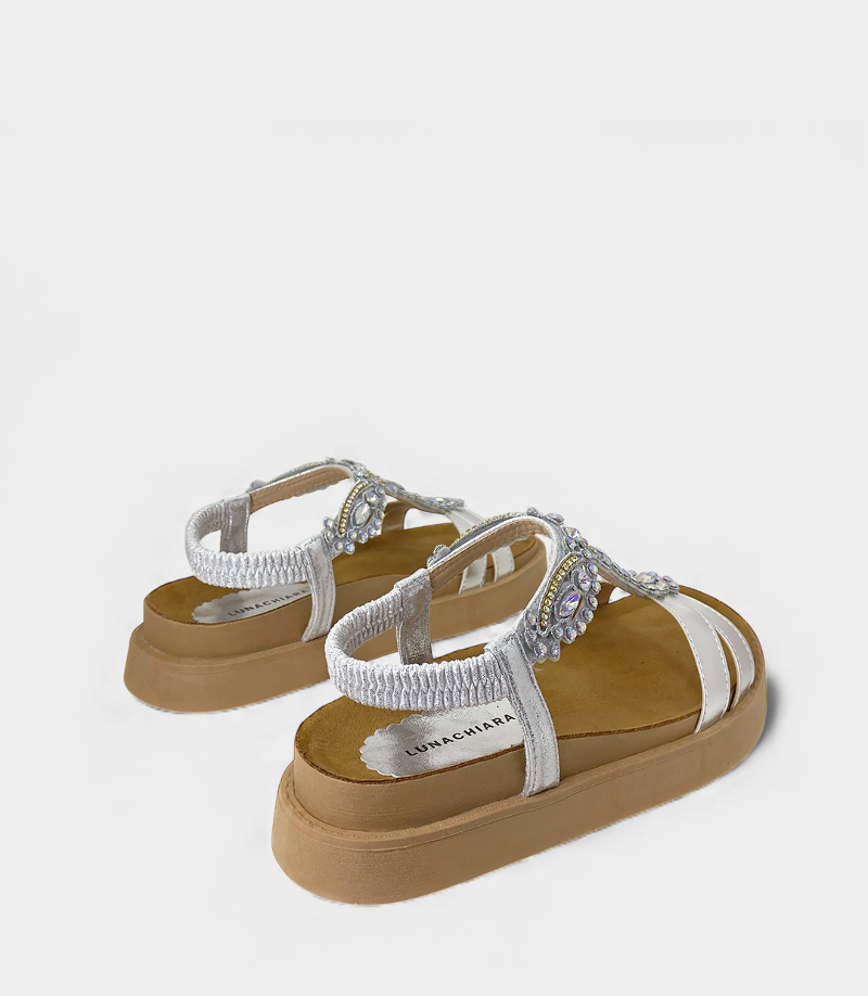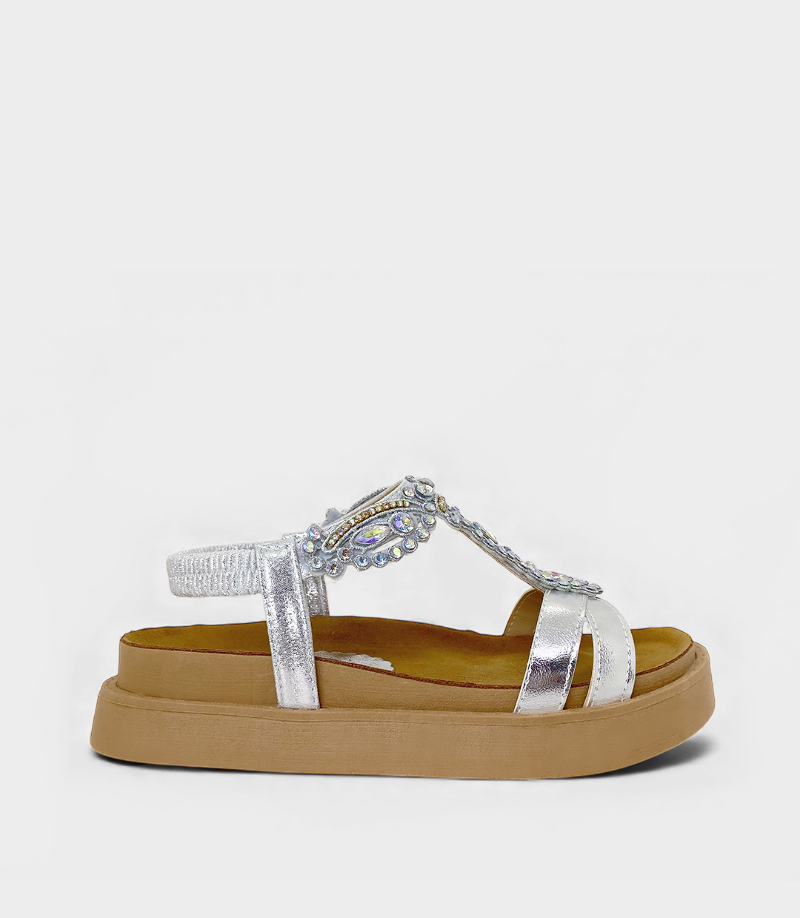 Este modelo combina una base cómoda, con un diseño de tiras frontales adornadas con pedrería y cristales al tono.