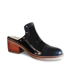 • Sueco con Tachas Nickel • Base de TR con Folia • Material: Cuero • Material interno: Pu • Temporada: Media Estacion • Altura de Taco: 6cm • Color: Negro Charol con puntera en Negro opaco