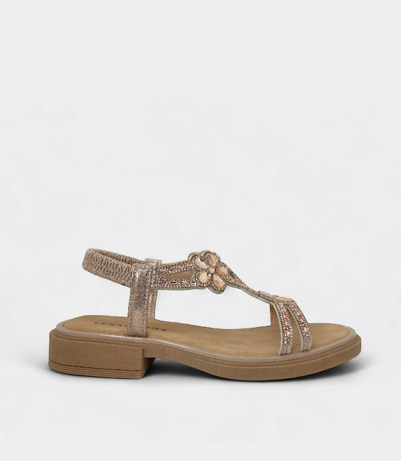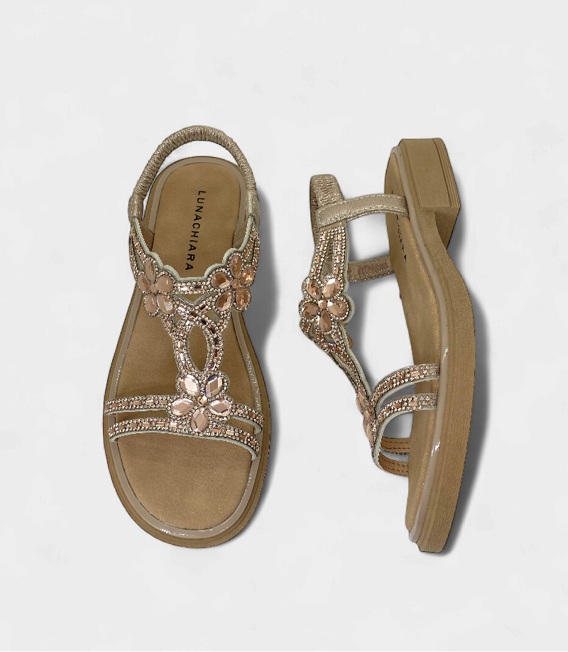 Son perfectas para quienes buscan un calzado sofisticado sin sacrificar el confort. El diseño de tiras frontales adornadas con apliques de strass y un detalle de flores, junto a la correa elástica en el talón, te darán un ajuste perfecto.