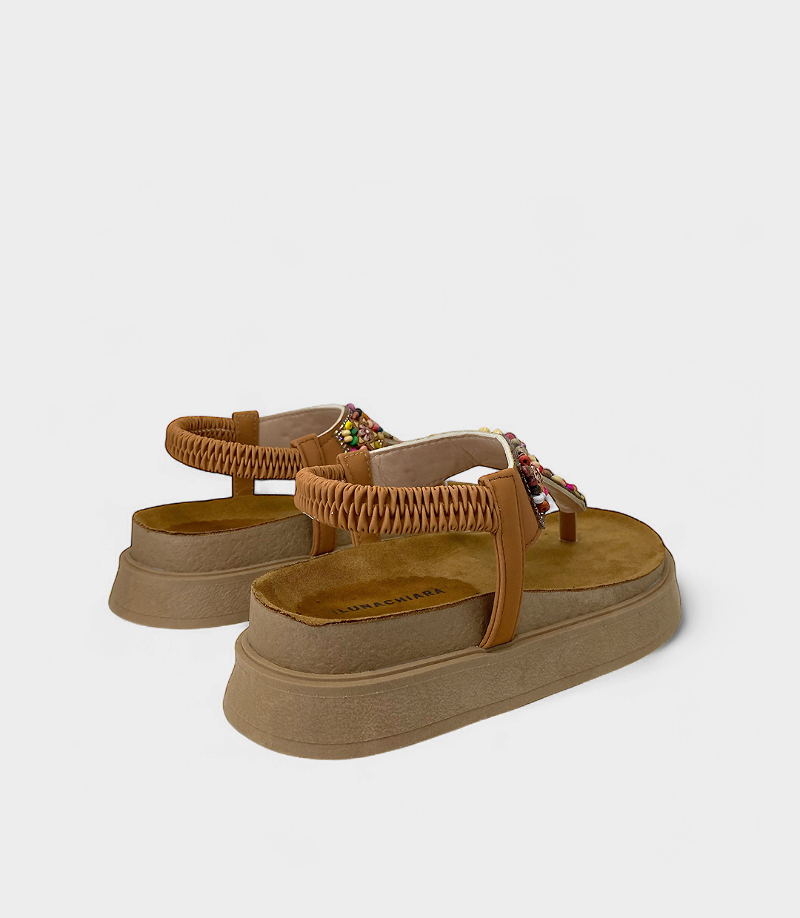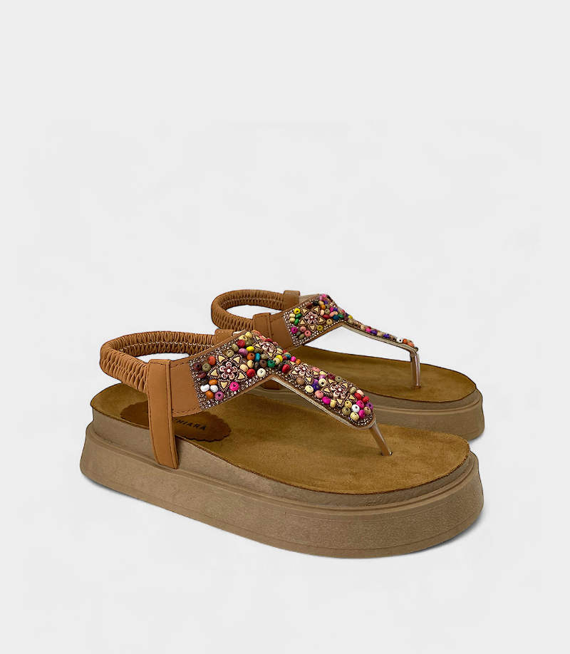 La sandalia Diana es la combinación perfecta de comodidad y estilo Boho Chic. Su diseño se complementa con tiras decoradas con cuentas y mostacillas multicolor.