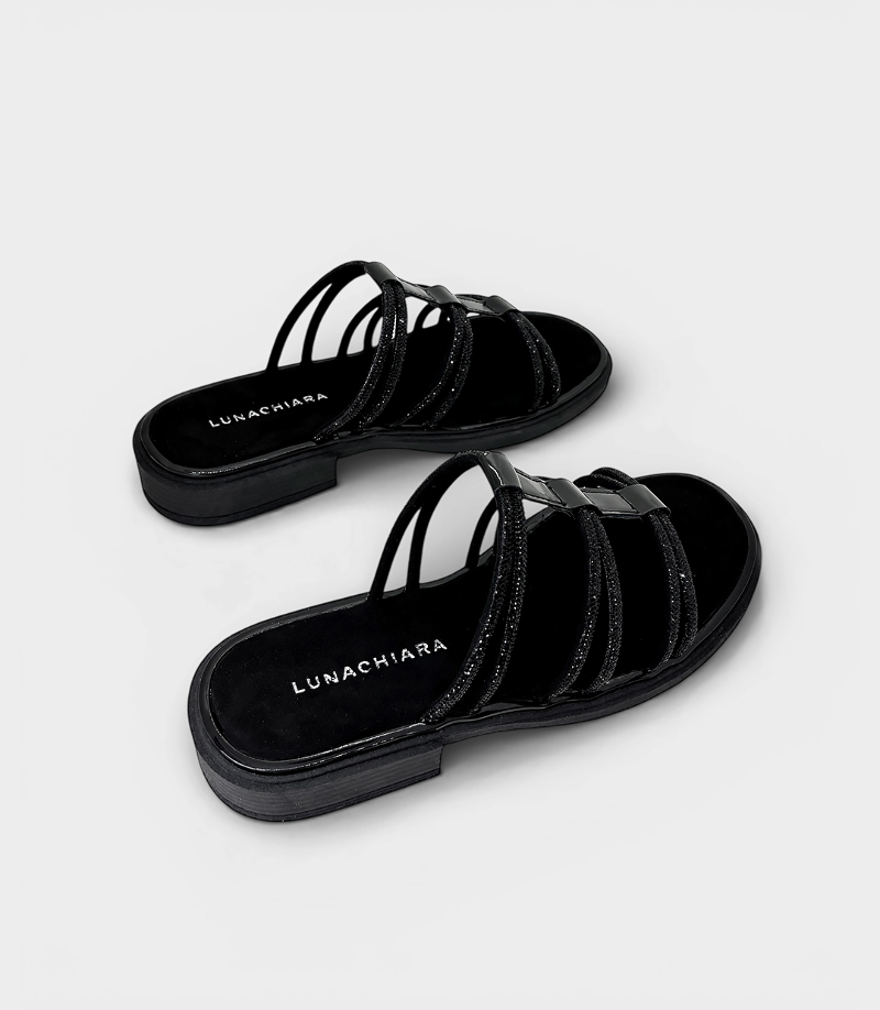 Diseño: Cuenta con varias tiras finas recubiertas de brillos, y una en el centro de charol.