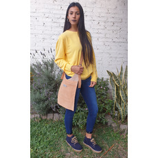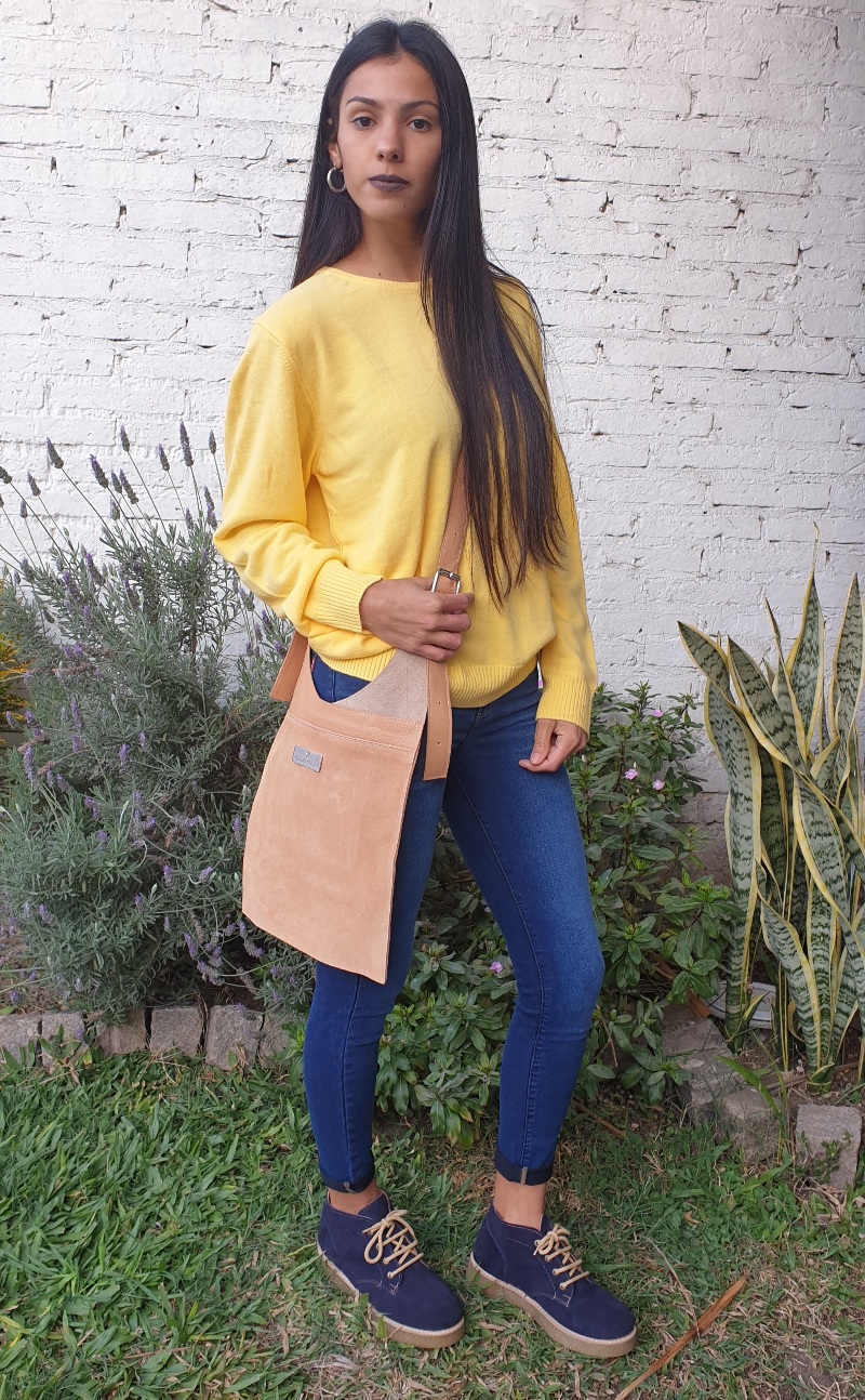 • MORRAL • Material: Gamuza Natural • Temporada: Todo el año • Medidas: 32 cm x 27cm • Color: CAMEL • Descripcion: Morral en gamuza y cuero.- Interior sin gross – bolsillo interno con broche