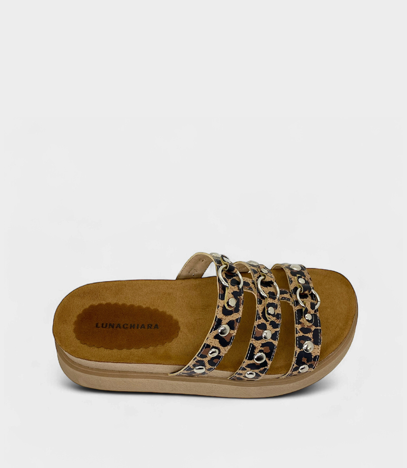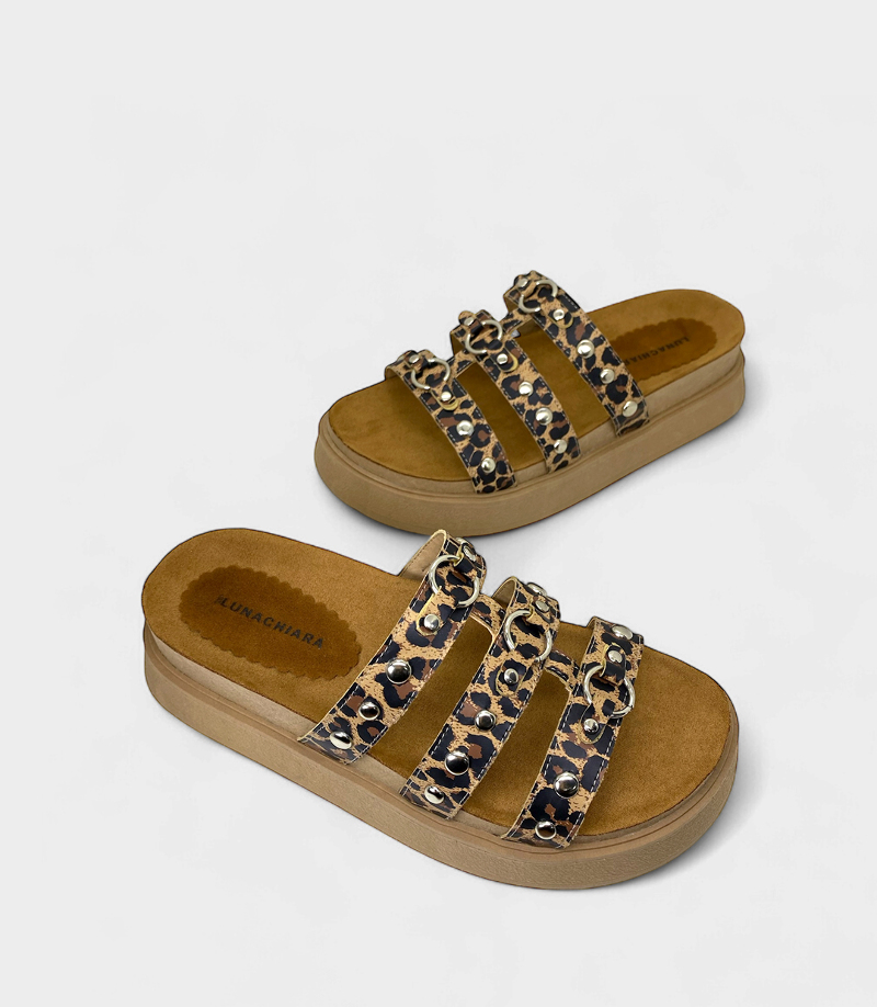 Estas sandalias de plataforma son pura declaración de estilo: audaces tiras de leopardo salpicadas con tachas plateadas que capturan miradas. La comodidad se une a la actitud en un diseño pensado para pisar fuerte y con carácter.