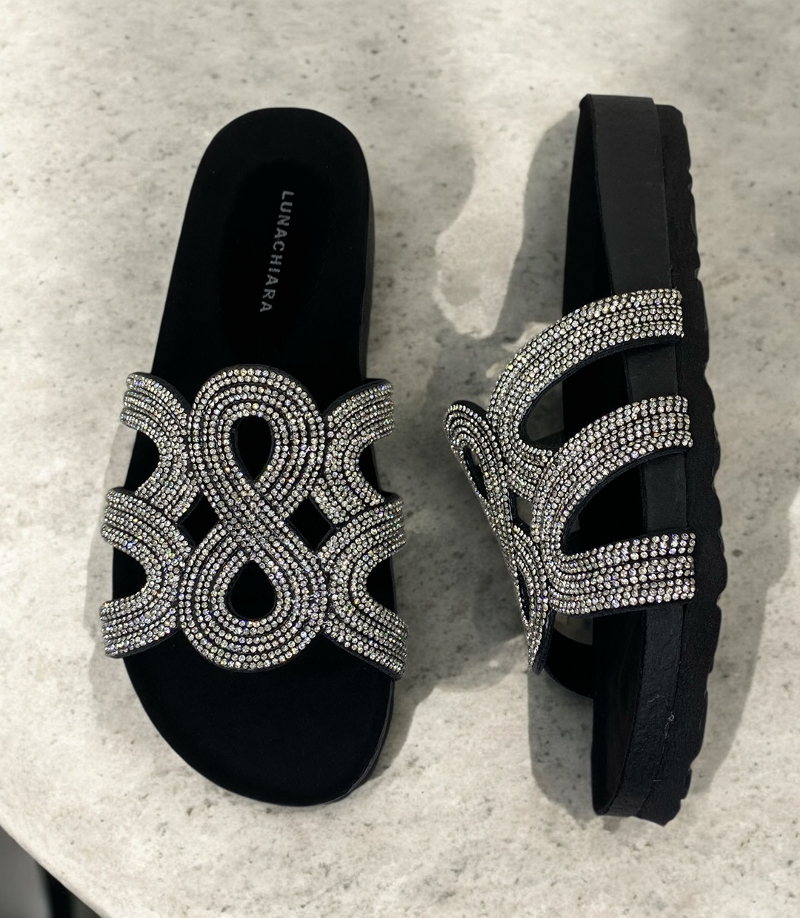 Nuestras sandalias Mery combinan el negro clásico con un destello increíble de brillos. Cómoda y con estilo.