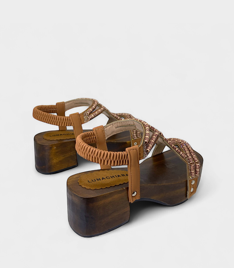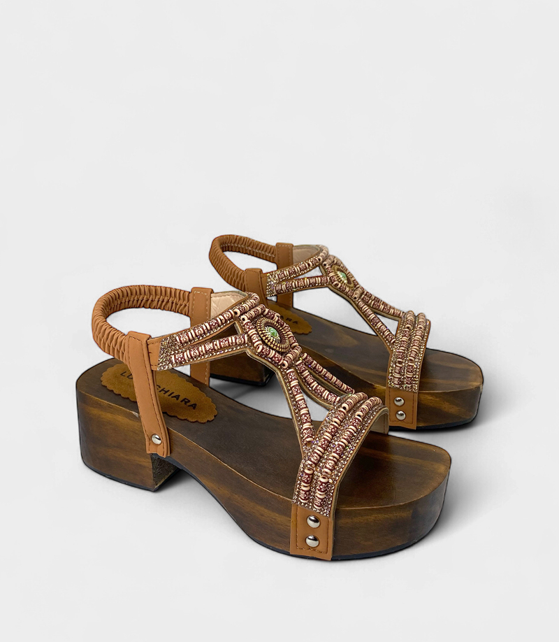 La sandalia Érica te transporta a la esencia Boho con un toque moderno y cómodo. Su base de efecto madera maciza, y su diseño de tiras bordadas la convierten en la pieza ideal para cualquier look de día o de noche.