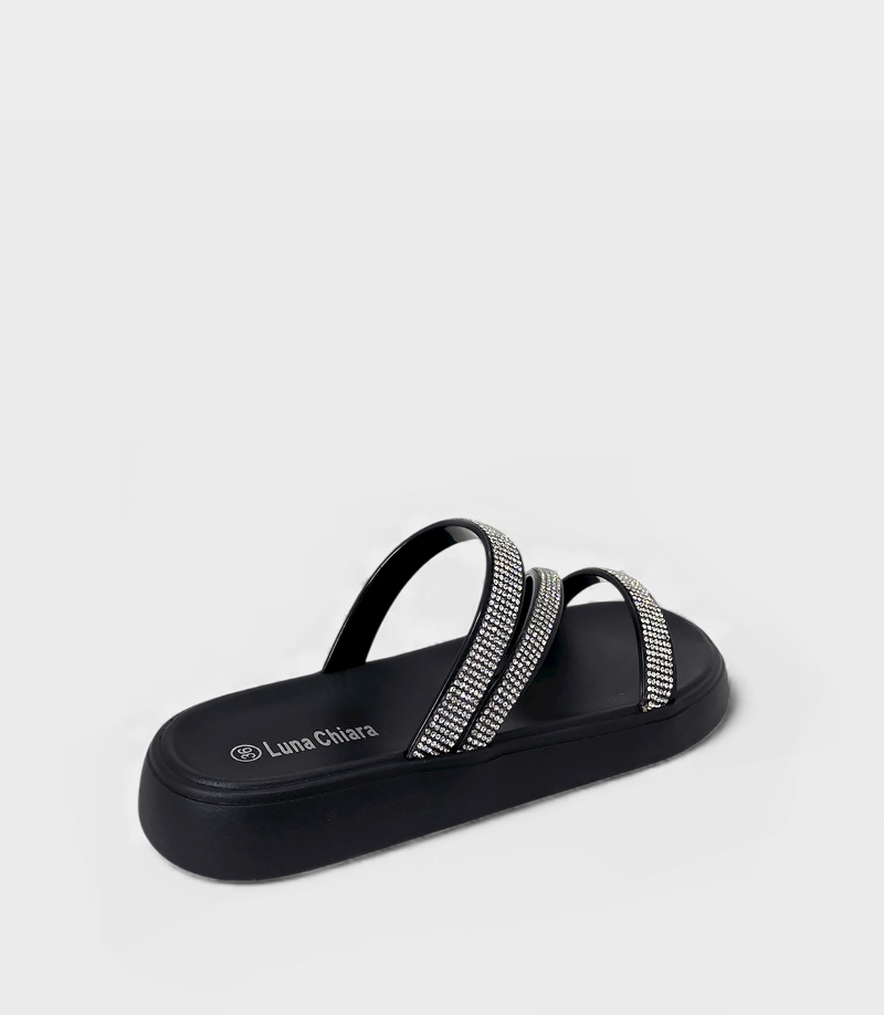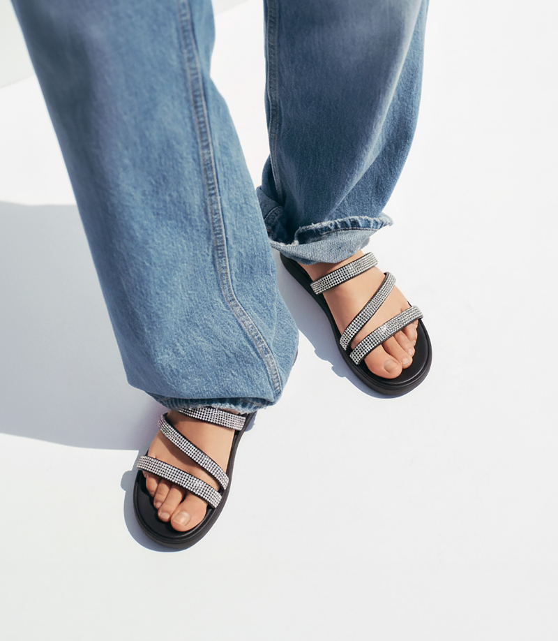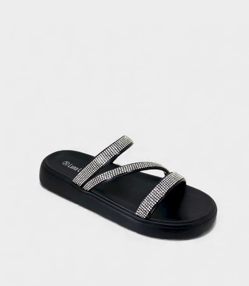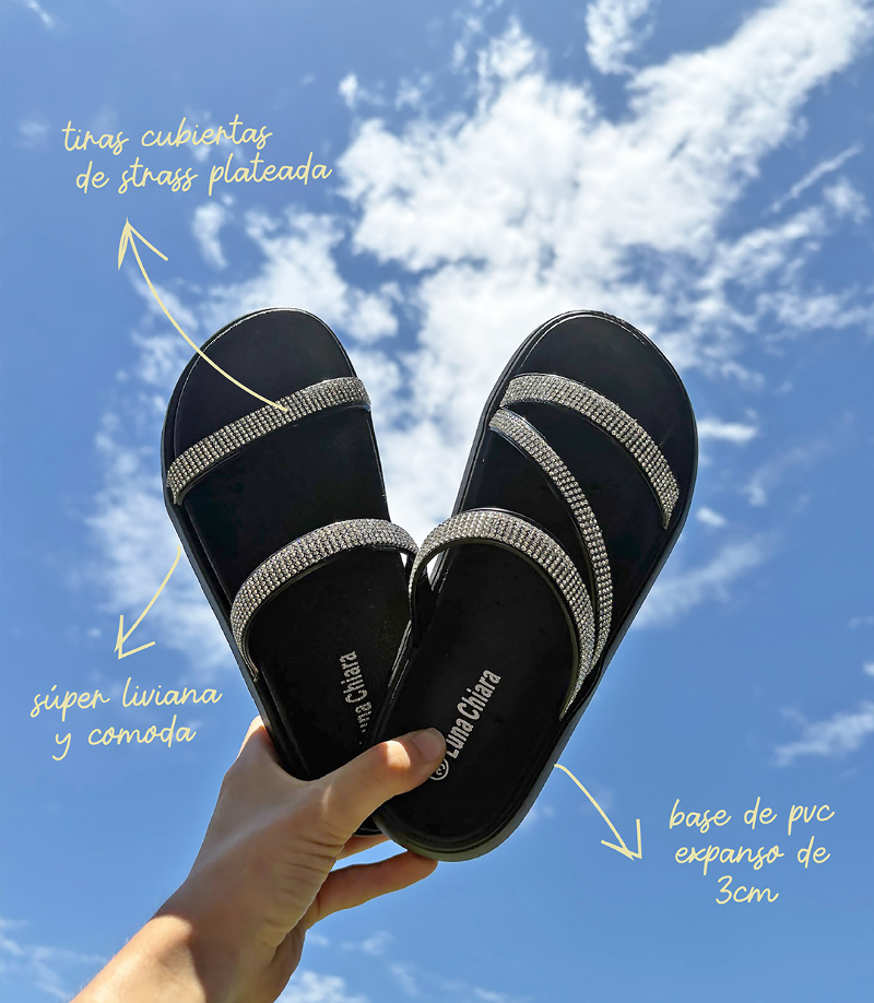 La Sandalia Zira es tu opción perfecta y liviana para el uso diario durante el verano. Este modelo tipo ojota combina la comodidad con un toque glamuroso, gracias a sus tiras de brillo.