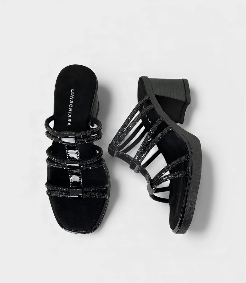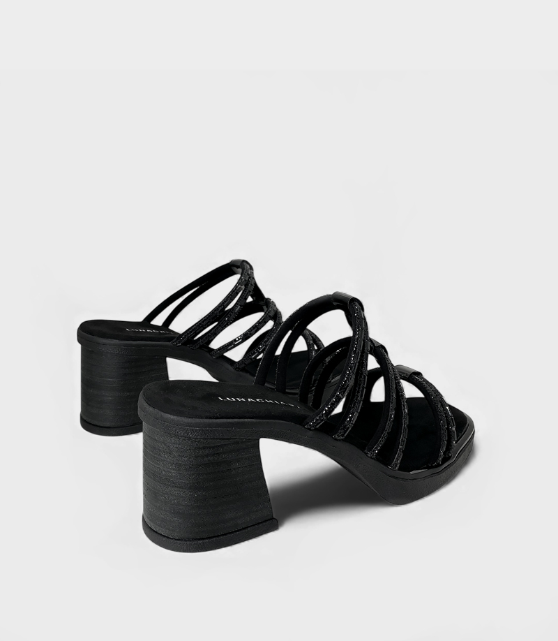 La sandalia Brenda es la elección ideal para tus looks de noche. Un diseño con taco que combina la elegancia del negro, con un toque de luz gracias a sus tiras finas cubiertas de brillo.