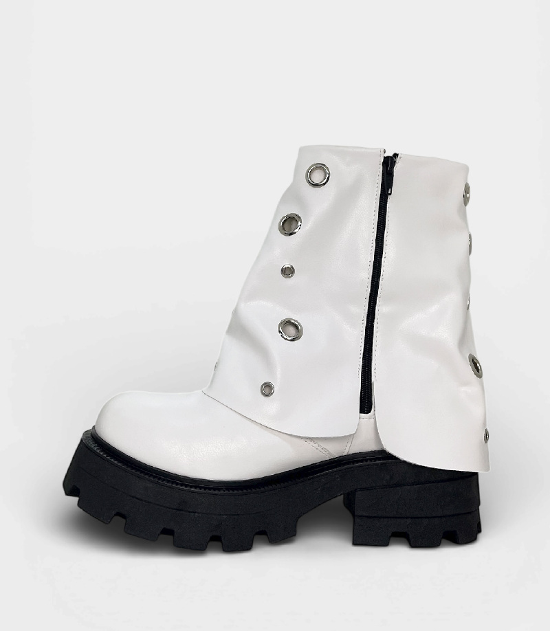 Negro, con base alta y caña cubierta de ojalillos metálicos. Borcego con mucha personalidad, ideal para levantar cualquier look con actitud y un toque dosmilero.
