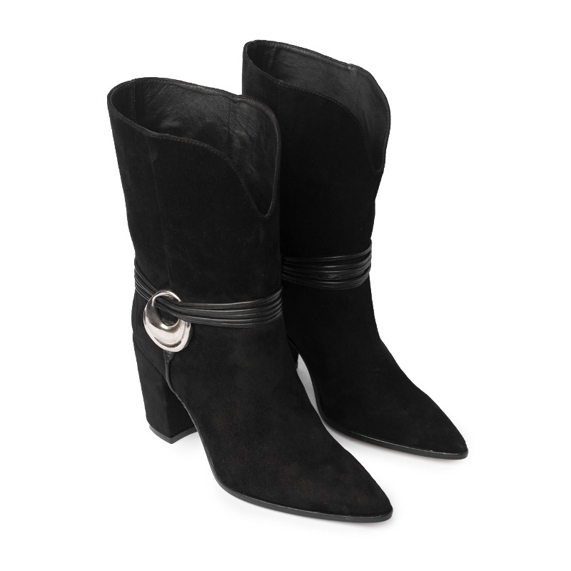 Botineta sin cierre con detalle de herraje y cordon charol. Material cuero vacuno. Altura de taco 7,5cm