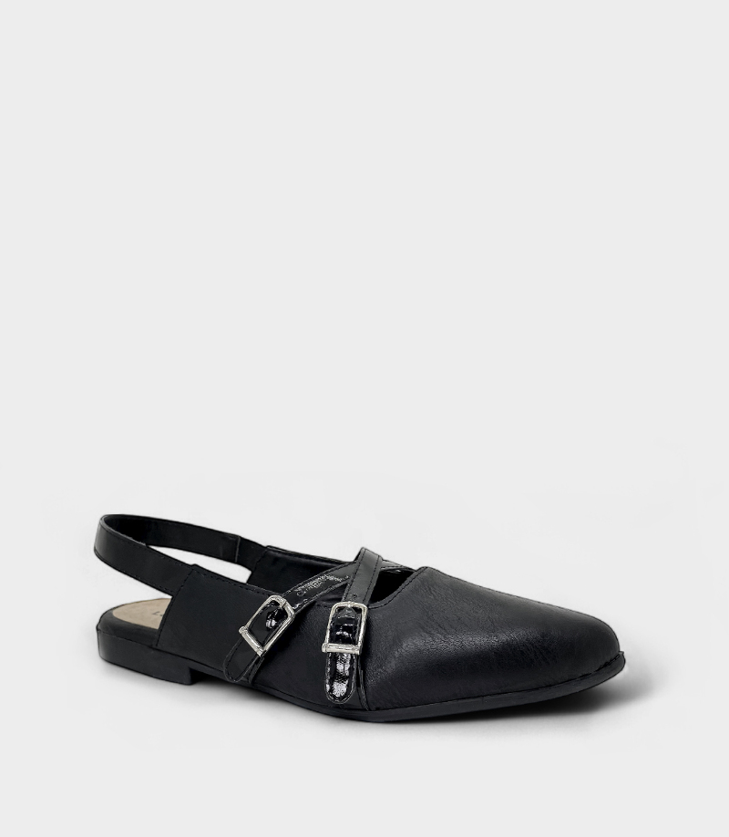 Punta fina, doble tira y mucha actitud. Con base simple y tiras negras, Yuli se reinventa en versiones que hace del zapato un protagonista. Material: Confeccionado en PU (cuero ecológico) Confort: Base plana y cómoda de 1,5 cm de altura.