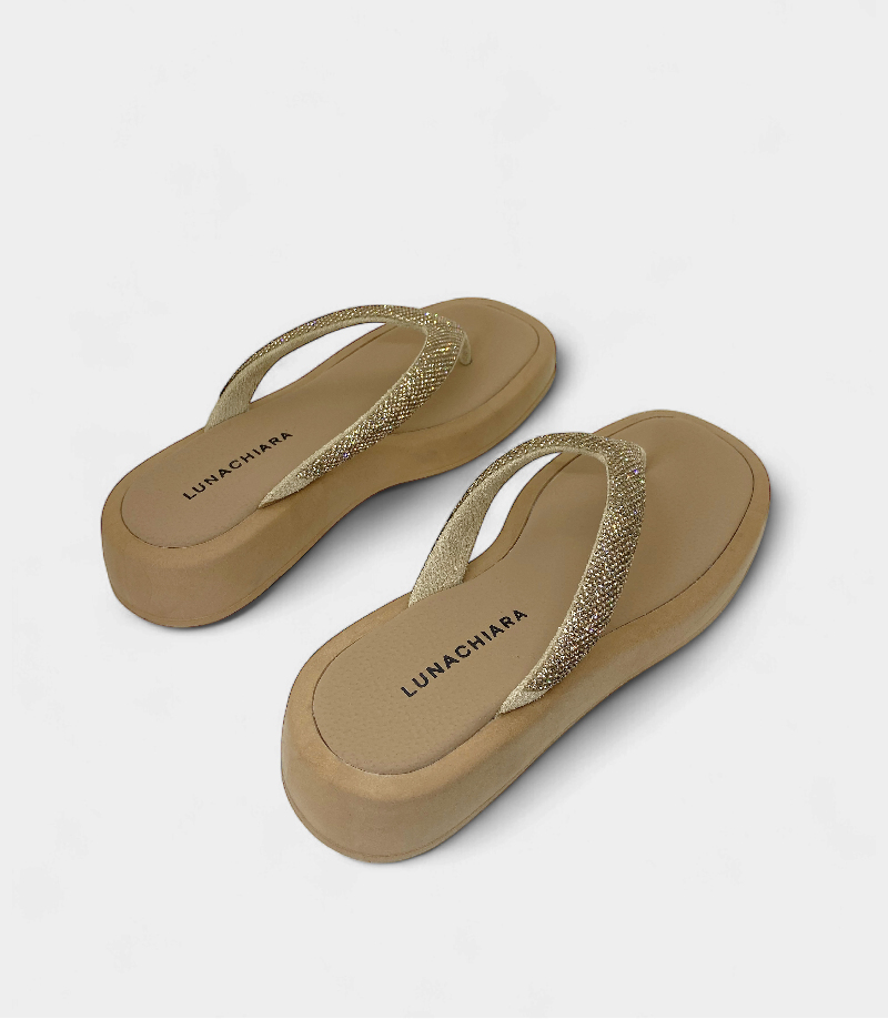 ¡Brillá a cada paso! combinan la comodidad de una suela de plataforma con un toque de glamour. Sus tiras están recubiertas de strass, perfectas para un look casual pero sofisticado.