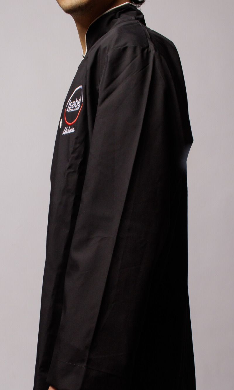 Casaca con cuello mao, confeccionada en tela Arciel, de corte recto y amplio, ideal para quienes necesitan libertad de movimiento. Incluye broches frontales, dos bolsillos inferiores y uno en el pecho, ofreciendo comodidad y funcionalidad.